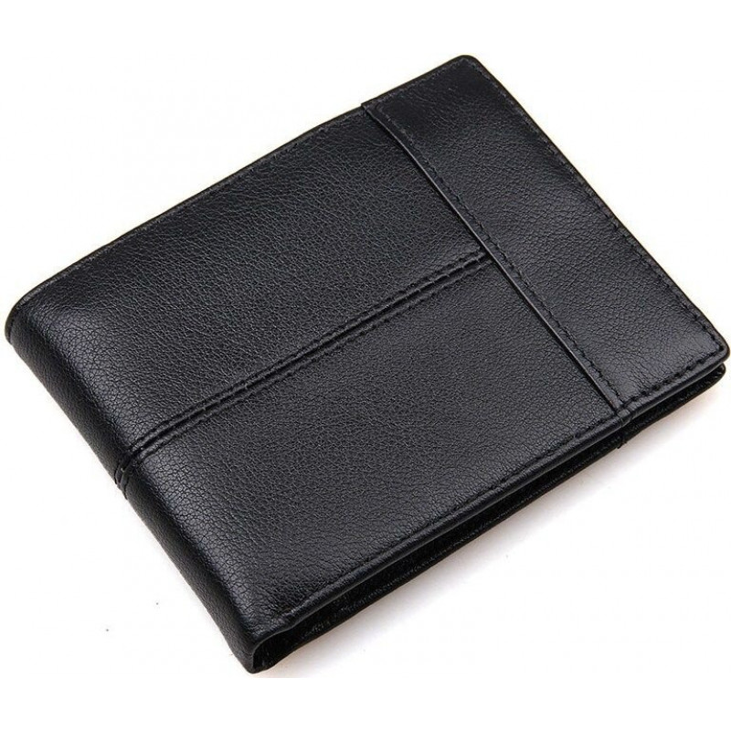 Сучасний чоловічий шкіряний гаманець чорного кольору. Аксесуар акуратно прошитий надміцною ниткою чорного кольору, всередині гаманець має дві кишені для купюр. Які поміщаються в розгорнутому вигляді. Є відділення для карток, монетниця на кнопці і прозора кишеня для документів. Гаманець зручний у використанні, легко поміщається в кишеню штанів, не займає багато місця в сумці. Гаманець упакований в текстильний пилозахисний чохол.