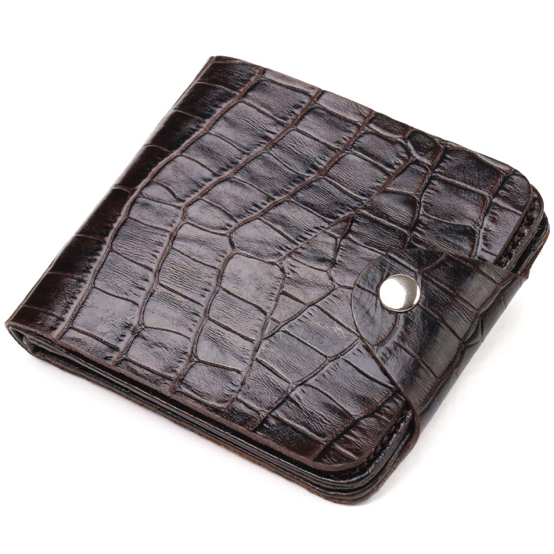 Красивий чоловічий гаманець із натуральної фактурної шкіри із тисненням під крокодила. Аксесуар має одне відділення для купюр, в яке розміщуються купюри всіх номіналів, чотири прилеглі кишені, кишеня на блискавці, на всю довжину гаманця, а також вісім відсіків для карток, один з них під сіточкою. Модель закривається хлястиком на кнопку. У сучасному світі шкіряне портмоне є просто необхідною річчю, а якісне шкіряне портмоне є ще й непоганим вкладенням грошей, оскільки прослужить не один рік.