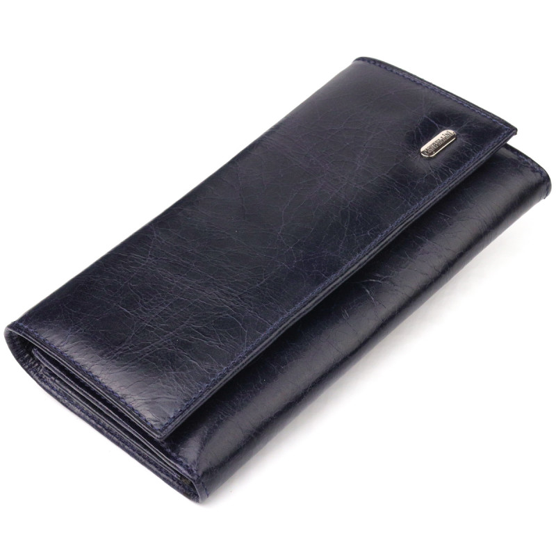 Чудовий горизонтальний жіночий гаманець із натуральної гладкої шкіри, в стильному синьому кольорі. Аксесуар має три великі кишені для купюр, три прилеглі кишені, вісім осередків для карток, три з них під сіточкою, монетницю на блискавці. Виріб закривається клапаном на кнопку. Відмінна ідея для подарунка, яка не залишить байдужою жодну жінку.
