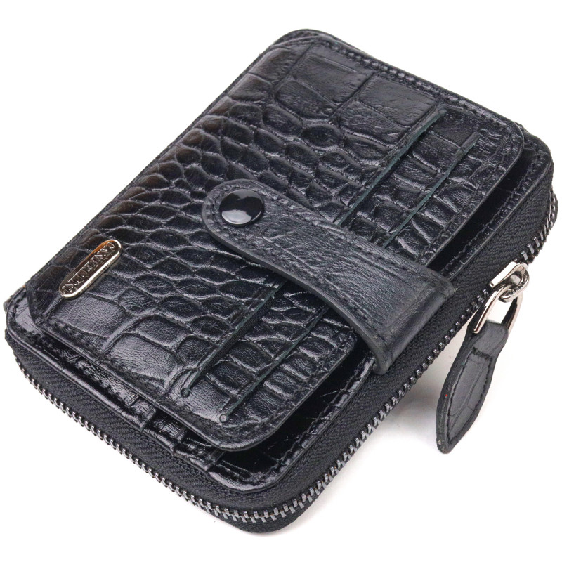 Цікавий гаманець для жінок з натуральної фактурної шкіри з тисненням під крокодила. Аксесуар має одне основне відділення, в яке поміщаються купюри всіх номіналів, одинадцять кишень для карток, одна з яких під сіточкою, блок для карт із зовнішнього боку, а також кишеня для пропуску під сіточкою з лицьового боку. Закривається аксесуар на блискавку, а блок для карток хлястиком на кнопку. Колір фурнітури – темне срібло. Шкіряний гаманець є дивовижним подарунком для дружини, дівчини, подруги.