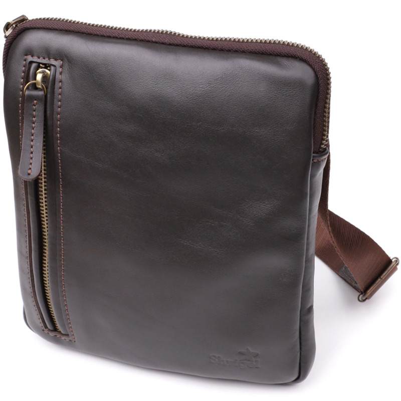 Ця чоловіча вертикальна сумка виготовлена українським брендом SHVIGEL, який відомий якісними шкіряними аксесуарами та увагою до деталей. Натуральна гладка шкіра насиченого коричневого кольору наголошує на елегантності, а фірмове тиснення логотипу підтверджує оригінальність виробу.