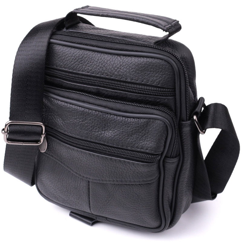 Практична невелика чоловіча сумка через плече з якісної шкіри з підвищеними показниками міцності та стійкості до зношування. Аксесуар зручно носити на плечі і через плече, для цього є текстильний ремінь, що регулюється, а також в руці, для цього передбачена шкіряна ручка. У дизайні цієї моделі немає нічого зайвого, а це особливо важливо для цінителів лаконічності. Усі кишені закриваються на блискавці, підкладка із міцного текстилю.