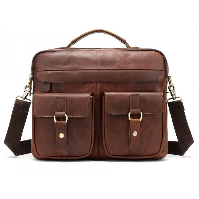 Солідна сумка-портфель для зайнятих і стильних чоловіків, щоб документи були завжди під рукою. Аксесуар доповнено золотистою фурнітурою і прошито коричневою ниткою. Модель можна носити як за шкіряну ручку, так і за допомогою текстильного ремінця на плече. Усередині міцна текстильна підкладка коричневого кольору. У догляді модель не примхлива і довго носиться. Буде ідеальним варіантом для подарунка близькій людині. Аксесуар упакований в тканинний мішок.
