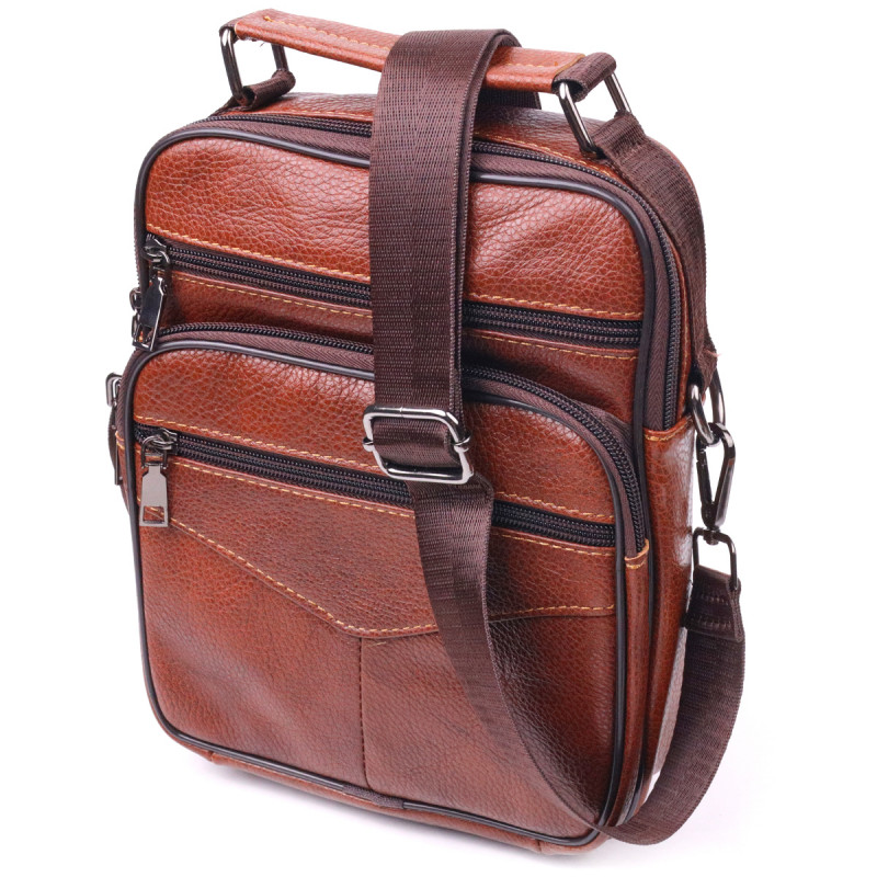 Зручна чоловіча сумка середнього розміру із натуральної шкіри. Модель, яка ідеально підійде на кожен день. В аксесуарі одне основне відділення та шість кишень різних розмірів, сумку можна носити як у руці, так і на плечі. У сумку з легкістю помістяться всі необхідні речі. З таким аксесуаром усі Ваші речі будуть у порядку, з ним також буде зручно ходити на роботу чи зустрічі. Доповнено виріб якісною фурнітурою, темно-срібло кольору. Сумка стане чудовим подарунком для близької людини.