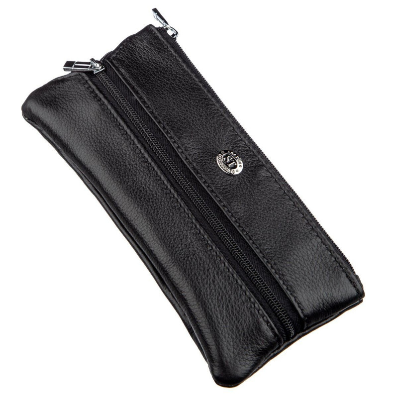 Современная и практичная ключница из натуральной кожи, мягкой и приятной на ощупь. Цвет – черный, что очень практично. Подойдет как мужчинам, так и женщинам. Имеет два отделения на молниях. В одном из них находятся два металлических кольца для ключей, которые фиксируются по принципу брелока. Кольца надежно держатся на металлических цепях. Во втором отделении Вы найдет еще четыре крючка для стандартных ключиков. Упакована ключница в плотную картонную коробку белого цвета.