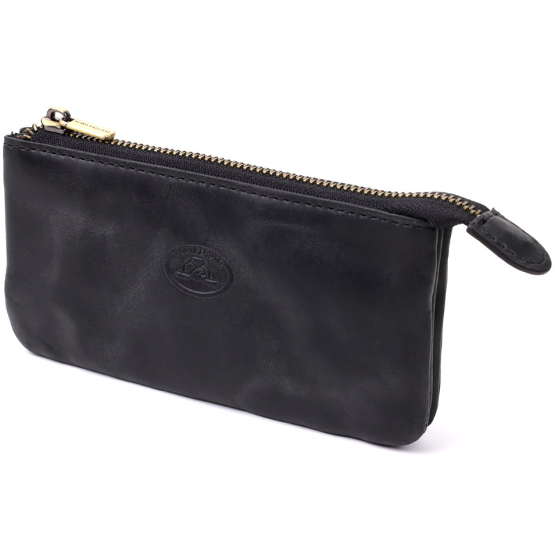 Ключница из натуральной винтажной кожи в черном цвете. Закрывается на молнию – удобно и надежно. Оснащена тремя отделениями и двумя кольцами для ключей. Дополнена брендированной фурнитурой высокого качества. Такая ключница объединяет функциональность и элегантность. Подойдет для ежедневного использования и станет достойным аксессуаром или подарком.