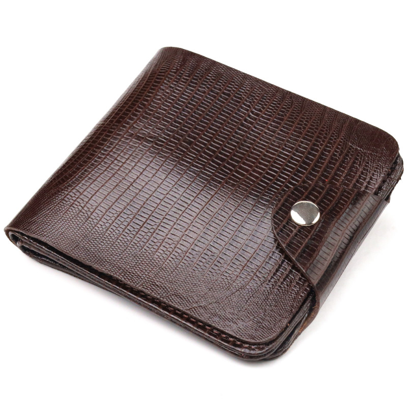 Модный мужской кошелек из натуральной фактурной кожи с тиснением под рептилию. Аксессуар имеет одно отделение для купюр, в которое помещаются купюры всех номиналов, четыре прилегающих кармана, карман на молнии, на всю длину кошелька, а также восемь отсеков для карточек, один из них под сеточкой. Закрывается модель хлястиком на кнопку. В современном мире кожаное портмоне является просто необходимой вещью, а качественное кожаное портмоне является еще и неплохим вложением денег, так как прослужит не один год.
