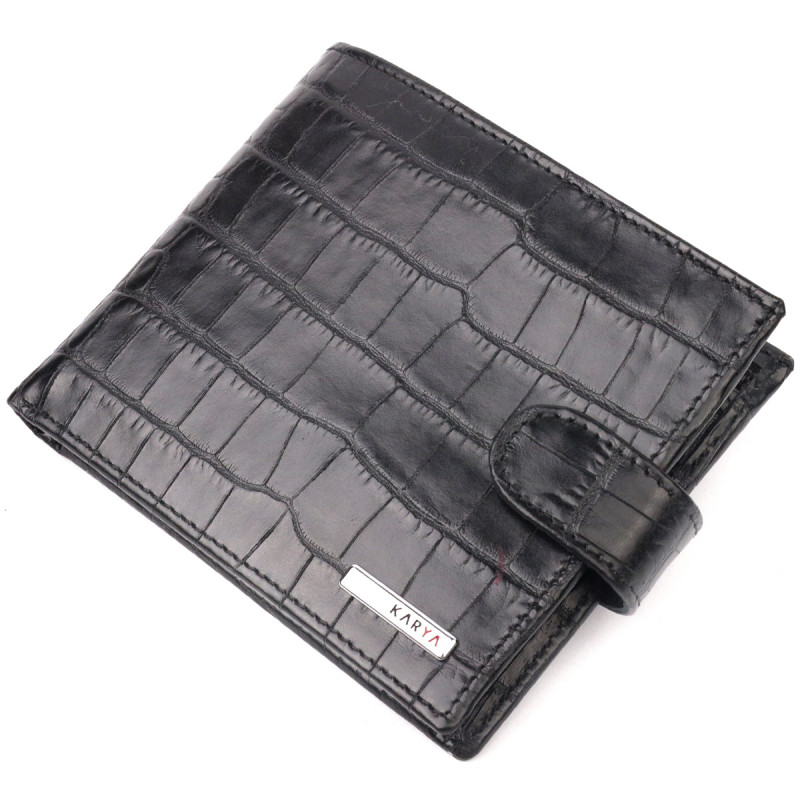 Горизонтальное узкое портмоне с хлястиком из натуральной фактурной кожи под крокодила KARYA Черный