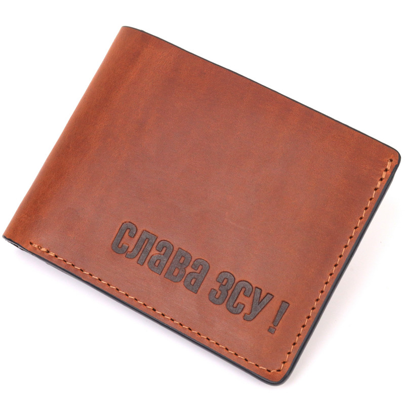 Практичный кожанный кошелек светло-коричневого цвета , c патриотической надписью “Слава ЗСУ”. Изделие пошито из качественной кожи, с високими показателями износостойкости . Портмоне имеет одно большое отделение для купюр всех номиналов, а также достаточное количество отделений для карт, без застежки. Кожаный акссесуар, один из самых универсальных подарков, который будет долго служить и радовать владельца.