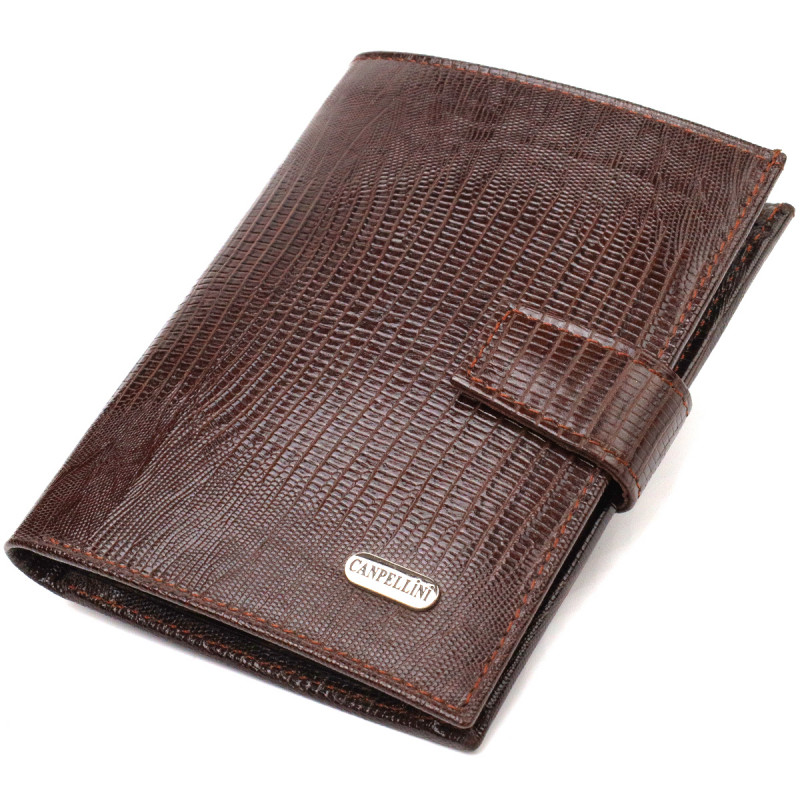 Оригинальное вертикальное мужское портмоне среднего размера из натуральной кожи с тиснением CANPELLINI Коричневое