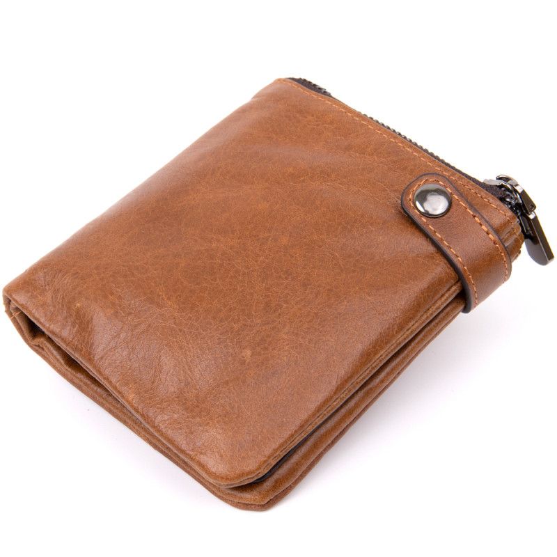 Тонкое компактное портомне из натуральной кожи с хлястиком на кнопке, закрывается портмоне сверху. Изделие имеет большой карман на молнии для купюр. Внутри достаточно ячеек для кредиток. Изделие продумано для современного человека. Который отдает предпочтение карточкам и носит минимум налички. Изделие имеет насыщенный рыжий цвет. Оригинальный аксессуар выгодно выделит вас из толпы. Кошелек станет прекрасным подарком для ваших близких.