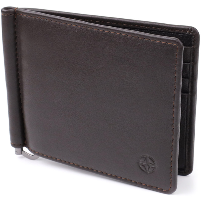 Аксессуар выполнен из натуральной гладкой кожи коричневого цвета. Внутри предусмотрены восемь слотов для карт и надежный металлический зажим для денег. На лицевой стороне в нижнем правом углу расположен тисненый логотип производителя, подчеркивающий оригинальность и статус изделия. Дизайн без застежки делает модель удобной в использовании и сохраняет компактность.