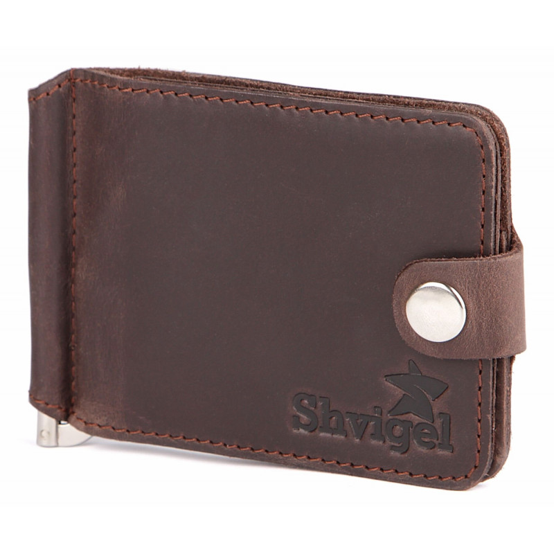 Шикарный зажим для банкнот коричневого цвета. Аксессуар выполнен из высококачественной винтажной кожи. Цвет фурнитуры: серебро. Изделие аккуратно прошито сверхпрочной нитью. Закрывается при помощи кожаного хлястика на кнопке. На задней внешней стороне аксессуара расположен карман для пластиковых карточек. Такой зажим для денег является отличным решением для подарка, так как упакован в красивый, фирменный текстильный чехол.