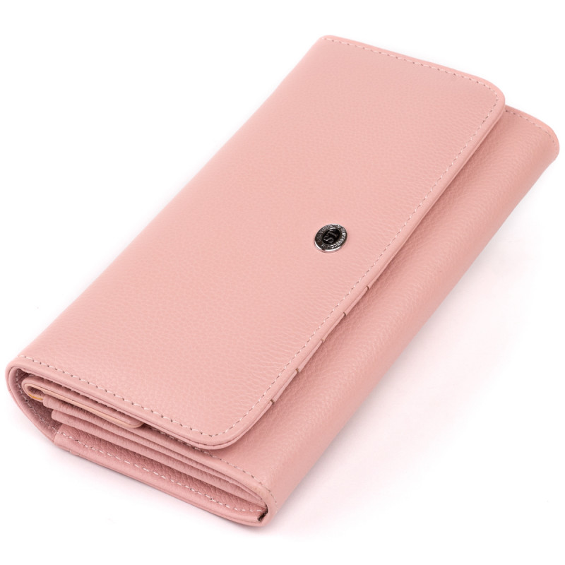 Элегантный женский кошелек из натуральной кожи нежного пудрового цвета. Кожа, из которой выполнен кошелек очень мягкая и эластичная. По краям кошелек прошит светлой строчкой. Кошелек состоит из двух автономных частей: для купюр и карточек и открытого отделения для личных вещей под кнопкой. На тыльной стороне карман открытого типа. На лицевой стороне металлический логотип бренда. В комплекте к кошельку идет фирменная картонная коробка. Изделие станет прекрасным подарком для близкого человека.