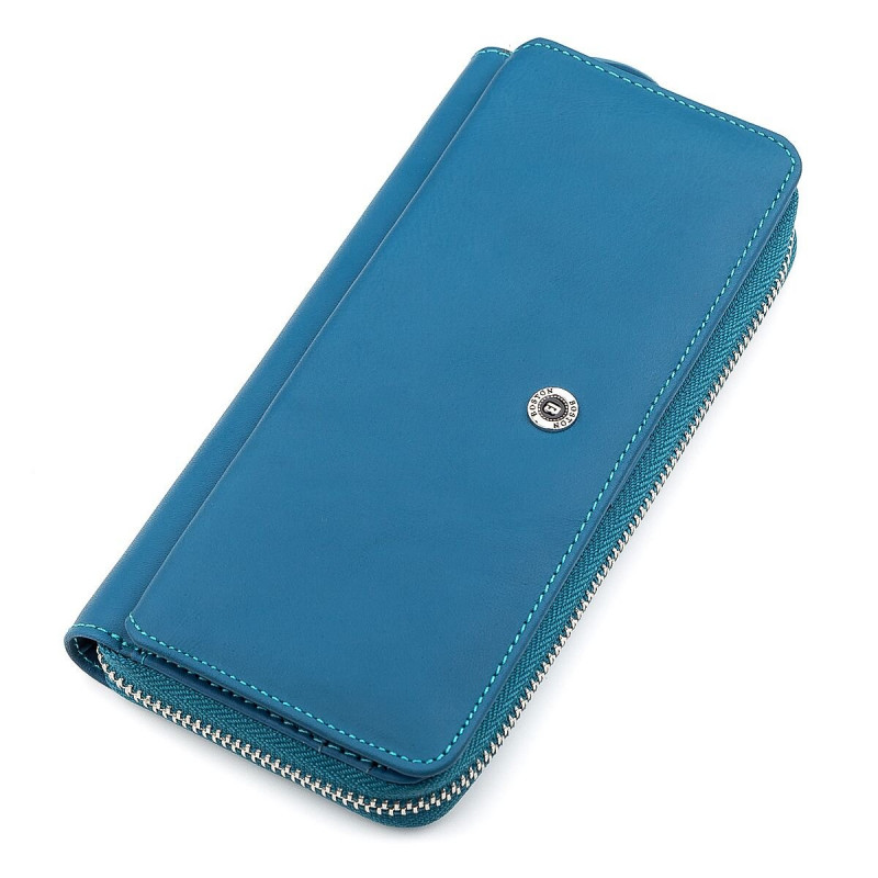 Представленная модель выполнена в красивом бирюзовом оттенке, с качественной, натуральной кожи. Закрывается аксессуар на молнию, чем позволяет на высшем уровне обеспечить сохранность содержимого, которого может быть очень много, ведь благодаря неплохим размерам доступна отличная вместительность. Снаружи есть также дополнительный блок для платежных карт, которых можно размещать 18 штук, вместе с внутренними ячейками. Порадует многих и привлекательная упаковка, оформленная в фирменном стиле с логотипом бренда.