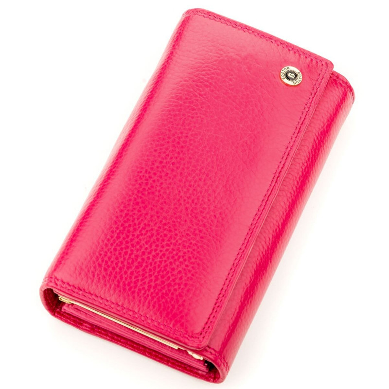 Представляемая модель изготавливается из прочной и износостойкой кожи, фиксируется на кнопку и оформлен в нежном розовом цвете. Благодаря удобному развороту есть доступ ко всем отделениям, отсекам и ячейкам, а также имеется дополнительный блок для платежных карт. Кошелек вместительный и удобно располагается в руках, карманах и сумочке. Дополнительно порадует и фирменная коробка, которая имеет презентабельный вид.