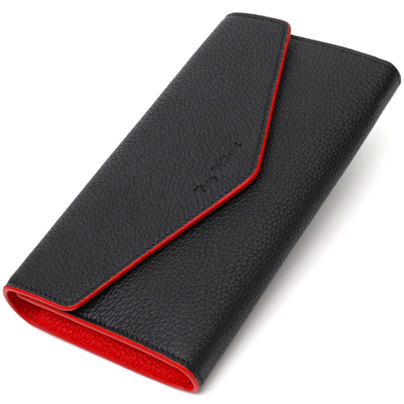 Стильный вместительный женский кошелек из натуральной кожи, в комбинации из двух цветов черного снаружи и красного внутри. Аксессуар состоит из двух широких отделений для купюр, двенадцати ячеек для пластиковых карт, двух прилегающих карманов и монетницы на молнии. В изделии использована качественная фурнитура золотистого цвета. Закрывается кошелек треугольным клапаном на кнопку. Покупая этот кожаный кошелек, Вы не только приобретаете стильную вещь, но и получаете качественный аксессуар, который прослужит не один год.