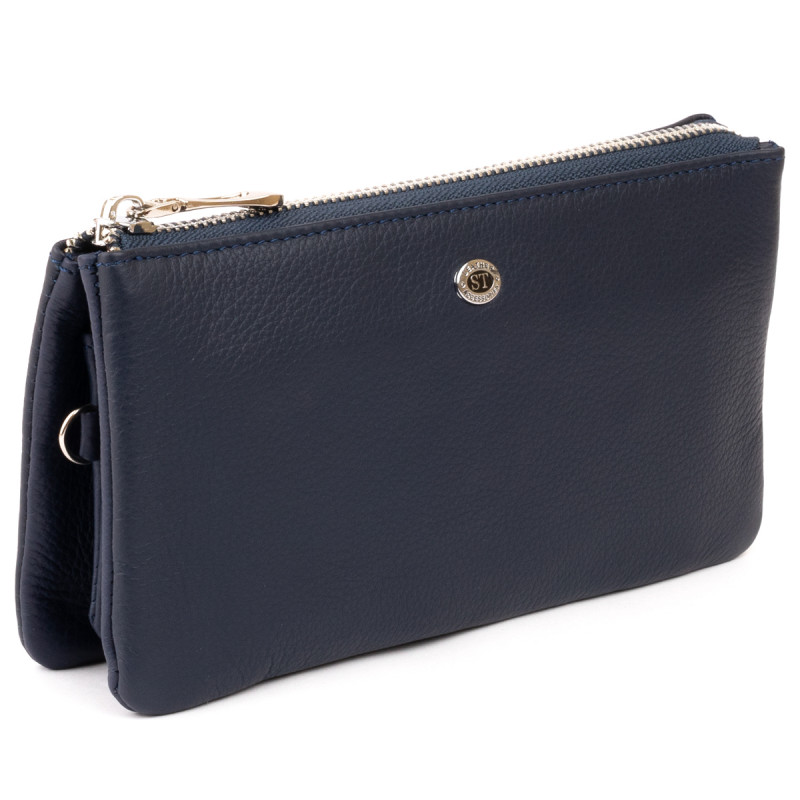 Универсальный женский клатч из натуральной кожи синего классического цвета. Модель придает уверенности и завершенности вашему образу. Изделие состоит из двух вместительных карманов на молнии и кармашка перегородки на молнии. Особенностью данного клатча является то, что вы можете поместить в него паспорт и мобильный телефон. Глубокие карманы очень правильно и практично продуманы дизайнерами. Изделие имеет легкий запах натуральной кожи. Сам клатч мягкий и приятный на ощупь. Внутри клатч сделан из натуральной кожи и плотного текстиля. В комплекте идет фирменная коробка с логотипом бренда. Кожаный клатч станет лучшим подарком для любой девушки.