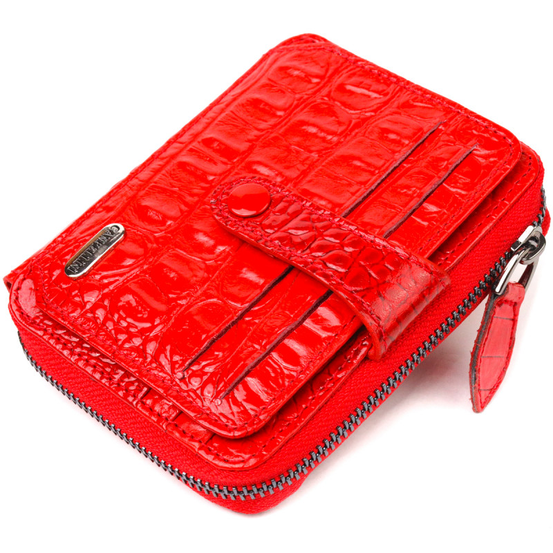 Яркий женский кошелек, из натуральной фактурной кожи, с тиснением под крокодила. Аксессуар имеет одно основное отделение, в которое помещаются купюры всех номиналов, одиннадцать карманов для карточек, один из которых под сеточкой, блок для карт с внешней стороны, а также карман для пропуска, под сеточкой с лицевой стороны. Закрывается аксессуар на молнию, а блок для карт хлястиком на кнопку. Цвет фурнитуры – темное серебро. Кожаный кошелек является удивительным подарком для жены, девушки, подруги.