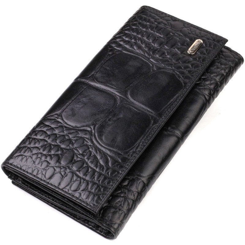 Кошелек для стильных женщин из необычной фактурной натуральной кожи с тиснением под крокодила. Аксессуар имеет одно основное отделение, семнадцать карманов для карточек, четыре прилегающих кармана и монетницу. Особенностью данной модели является наличие блока для кредитных карт, который закрывается хлястиком на кнопку. На лицевой стороне, в правом нижнем углу металлический логотип компании производителя. Если Вы выбрали товар этой фирмы, можете не сомневаться, что изделие прослужит очень долго и не потеряет свой первоначальный вид.