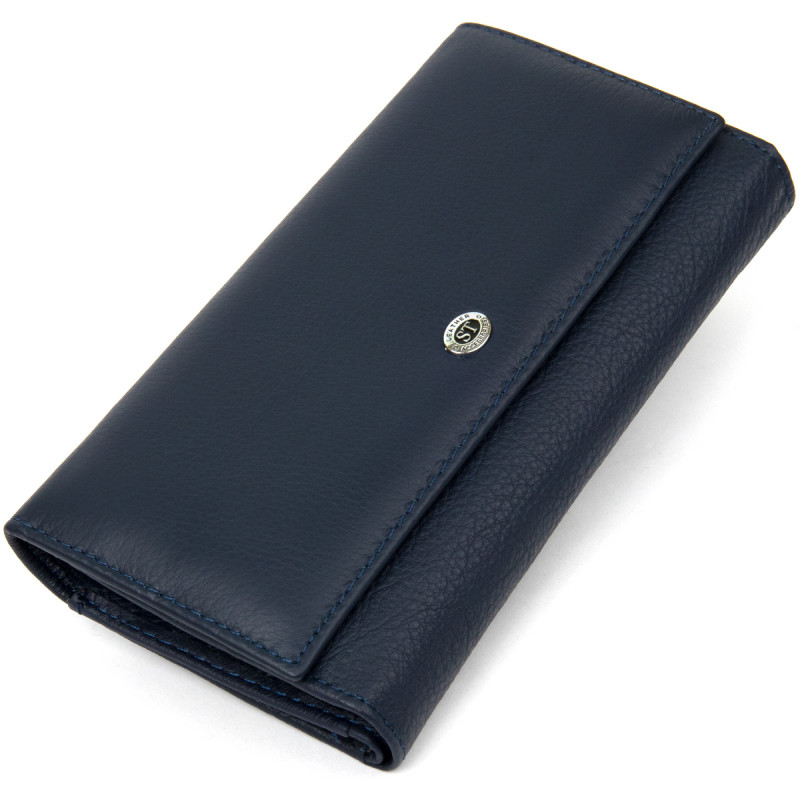 Материал: натуральная кожа. Цвет: темно-синий. Размеры (ШхВхГ, см): 19х10х3 см. Страна производитель: Китай. Бренд: ST Leather. Описание: - основное отделение закрывается на два магнита; - внутри расположено четыри больших отделения для купюр по всей длине; - одно отделение на всю длину для прочих ценных вещей; - 2 отделения на молниях; - 4 карманов для карточек; - на внешней стороне размещены слоты для карт 10 шт; - отделение на всю длину кошелька; - прозрачный кармашек; - слоты закрываются на хлястик с кнопкой, которая регулирует объём его наполнения; Отменный женский кошелек из натуральной кожи в спокойном темно-синем цвете. Имеет приятную на ощупь фактуру и матовое покрытие. Имеет отдельное отделение на кнопке специально для различных карт, его наполнение можно регулировать. Данная модель обязательно придётся по вкусу даже самым требовательным хозяйкам.