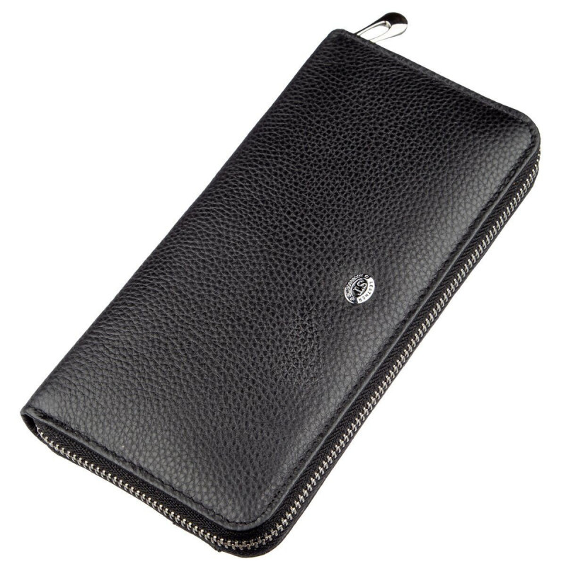 Универсальный женский клатч на молнии для удивительных и прекрасных женщин. Материал исполнения – натуральная высококлассная кожа черного цвета, с нежной зернистой фактурой. Черный цвет дает возможность носить данный клатч под любой женский гардероб. Внутри изделия есть множество отделений и карманов для купюр, документов и различных карт и визиток. Монетница расположена на тыльной стороне аксессуара и закрывается на молнию. Если Вы подыскиваете себе удобный и практичный клатч, то это прекрасный вариант как для Вас лично, так и на подарок. Упаковка кошелька представлена в виде картонной коробки с фирменным логотипом белого цвета.