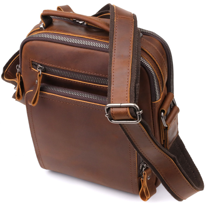 Коричневая кожаная сумка через плечо — стильный и практичный аксессуар на каждый день. Изготовлена из натуральной кожи с выразительной текстурой, дополнена фурнитурой цвета серебра. Модель оснащена двумя основными отделениями на молнии, внутри — потайной карман на задней стенке. На лицевой стороне размещены накладной кармашек и горизонтальный встроенный карман — оба на молнии. На тыльной стороне расположен еще один карман на молнии. Удобство переноски обеспечивают кожаная ручка и несъемный регулируемый кожаный ремешок через плечо. Продуманная конструкция и благородный цвет делают эту сумку идеальным спутником для динамичного ритма жизни.