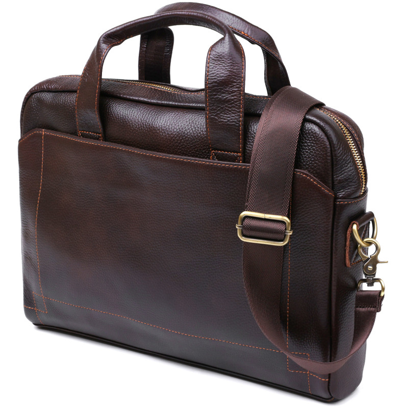 Замечательная мужская сумка для деловых людей из натуральной кожи высокого класса и повышенной стойкостью к износу. Выполнена данная модель в сочном коричневом цвете, что смотрится очень презентабельно и богато. Внутри есть просторное отделение, на внешней стороне присутствуют карманы на кнопках на всю длину. Фактура изделия – зернистая и приятная на ощупь.