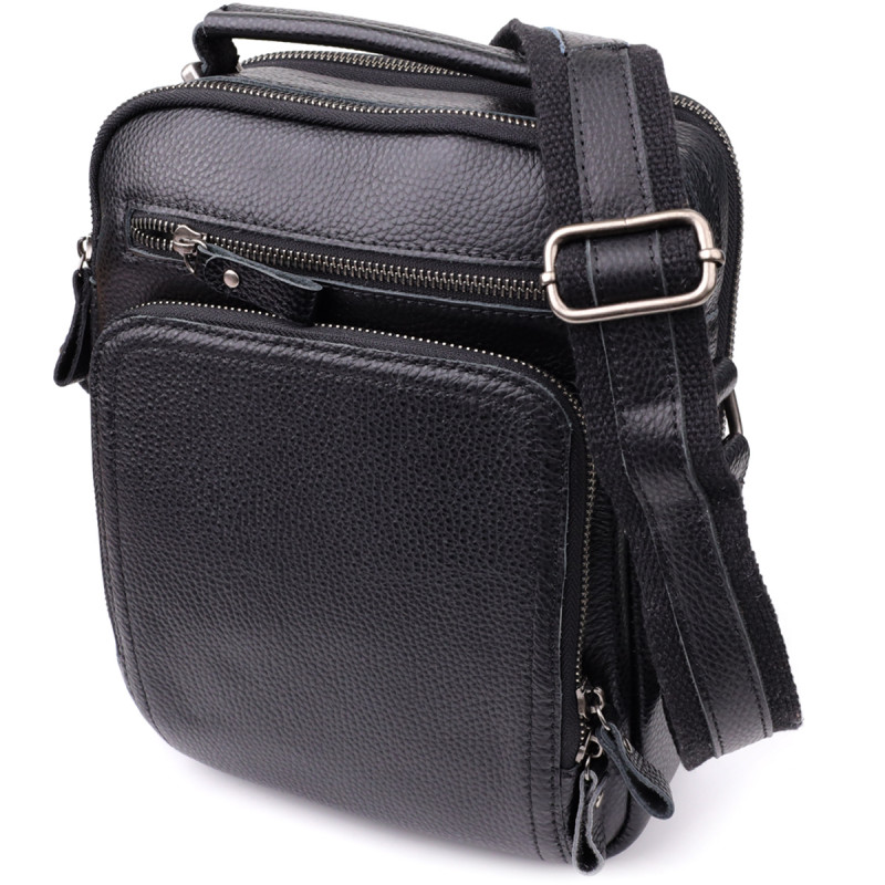 Черная кожаная сумка на плечо — практичный и стильный аксессуар для повседневного использования. Модель выполнена из натуральной зернистой кожи флотар, устойчива к износу и сохраняет аккуратный внешний вид. Оснащена двумя основными отделениями на молнии, в одном из которых предусмотрен потайной карман. На лицевой стороне размещены накладной карман на молнии и горизонтальный встроенный карман. На тыльной стороне — удобный карман на молнии. Сумка дополнена прочной кожаной ручкой и регулируемым несъемным кожаным ремешком для ношения на плече. Фурнитура цвета серебра придает модели сдержанную элегантность.