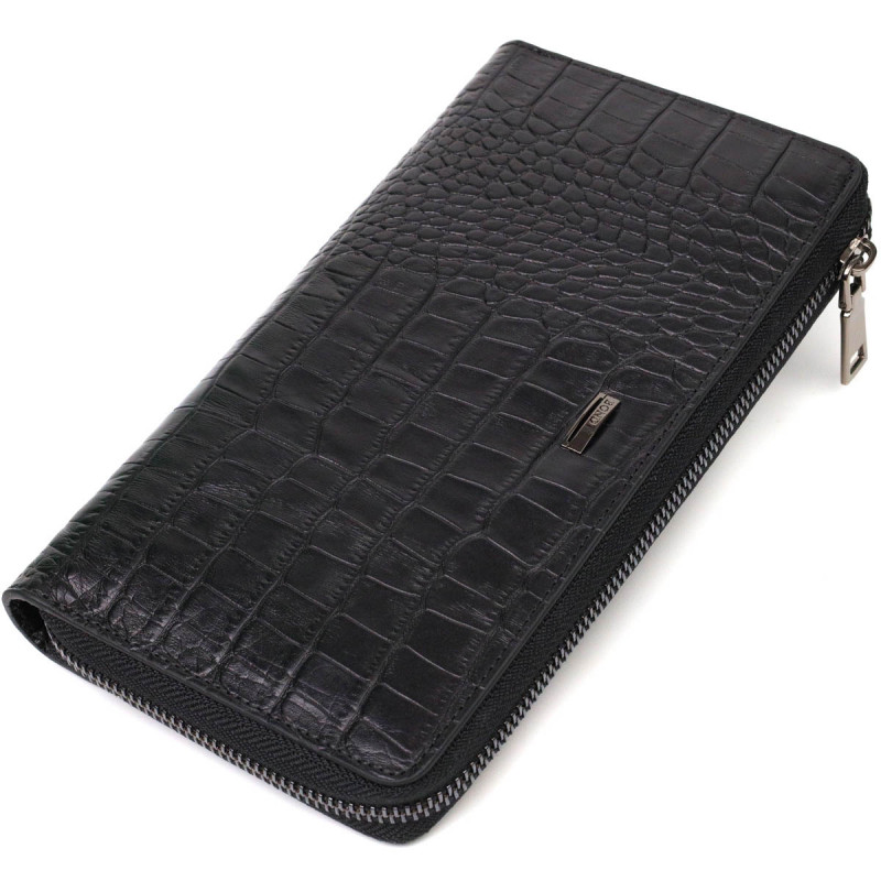 Удобный мужской клатч из натуральной кожи с тиснением под крокодила, кошелек закрывается на молнию, внутри можно без проблем размещать бумажные банкноты, банковские карты и даже смартфон. Аксессуар состоит из двух отделений для купюр, двух прилегающих карманов, семнадцати слотов для кредиток и монетницы на молнии. Имеется также ручка для ладони на тыльной стороне клатча. Продается бумажник в красивой коробке от производителя. Качественный и надежный клатч - именно такой аксессуар должен быть у каждого уважающего себя человека.