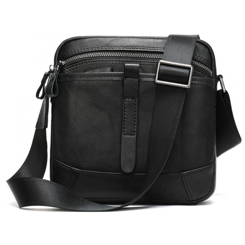 Компактная мужская сумка из натуральной кожи классического черного цвета и горизонтального формата. Внутри - коричневая текстильная подкладка. Дополнено изделие фурнитурой серебристого цвета из крепкого металла. Сумка станет идеальным помощником мужчине на каждый день. Изделие создано для мужчин, которые ценят качество и компактный размер. С ней будет также очень удобно ходить на работу. Изделие станет чудесным подарком для любого мужчины. В комплекте к сумке идет пылезащитный чехол. На лицевой стороне сумка дополнена кожаным хлястиком.
