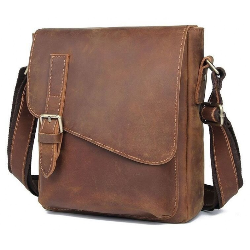 Отличная мужская сумка коричневого цвета. Аксессуар изготовлен из натуральной кожи высокого качества. Цвет фурнитуры: латунь. Сумку можно носить через плечо при помощи регулируемого плечевого ремня, который выполнен в комбинации текстильного полотна и натуральной кожи.