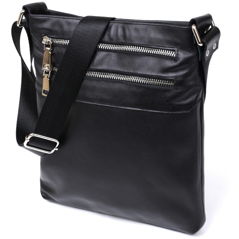 Современная сумка для мужчин из натуральной износоустойчивой кожи высокого качества. Имеет гладкую приятную на ощупь фактуру и универсальный черный цвет. Отлично подойдет мужчинам любого возраста. Основное отделение довольно вместительное и просторное, внешние три кармана на молнии. Ремень сделан из прочного текстиля и может регулироваться по длине.