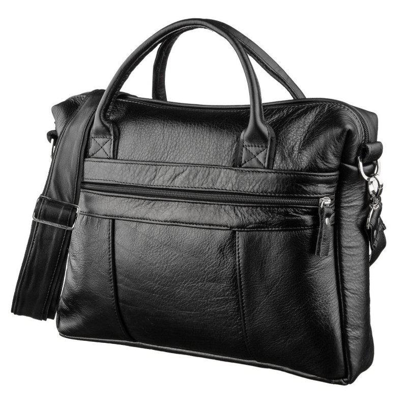 Практичная мужская сумка из высококачественной натуральной гладкой кожи мягкой на ощупь, черного цвета. За счет того что кожа мягкая на ней могут появляться складочки, что существенно 100% натуральной коже. В сумку поместится ноутбук диагональю 14 дюймов или папка с документами. Сумку можно переносить в руке при помощи удобных кожаных ручек, а также через плечо (в комплекте съемный, регулируемый плечевой ремень, который выполнен в комбинации текстильного материала и натуральной кожи). Дополнена сумка крепкой фурнитурой цвета серебра.