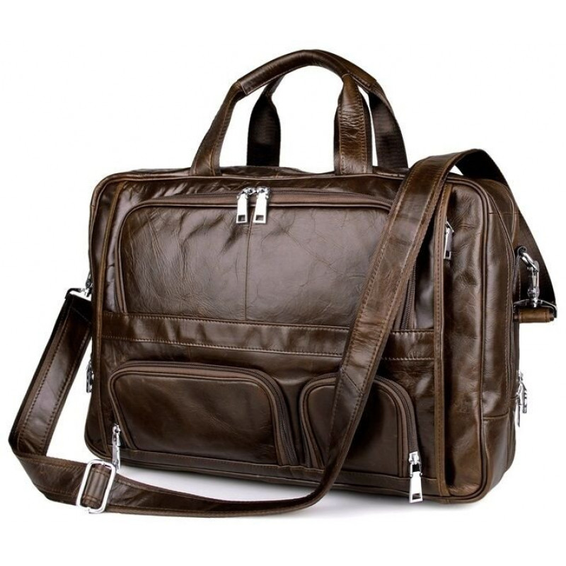 Большая мужская кожаная сумка с множеством отделений и карманов. Аксессуар можно переносить при помощи удобных ручек в руке, а также через плечо. На задней внешней стороне изделия расположена ручка с помощью, которой сумка при необходимости крепиться к чемодану. Цвет фурнитуры: серебро. Аксессуар можно использовать для носки папки с документами и ноутбука, а также как сумку для спортзала.