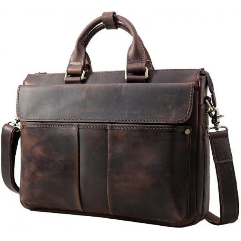 Вместительная мужская сумка из натуральной высококачественной кожи. Цвет фурнитуры: латунь. Сумку можно носить в руке при помощи кожаных ручек, а также через плечо, в комплекте съемный плечевой ремень из сочетания прочного текстиля и кожи. Аксессуар прошит коричневой прочной нитью, что придает изделию прочности и оригинального вида. Аксессуар закрывается на молнию. На лицевой стороне изделия расположено два кармана, один на молнии, другой под клапаном на магнитах. На задней внешней стороне находится отделение на молнии. Подкладка выполнена из прочного текстильного материала черного цвета.