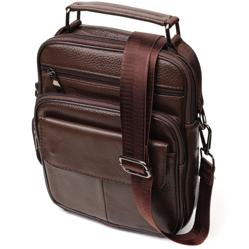 Мужская удобная сумка из натуральной кожи. Аксессуар состоит из основного отделения на молнии, потайного кармана внутри, накладного кармана на молнии, на лицевой стороне, встроенного кармана на молнии на лицевой стороне, встроенного кармана под клапаном на магнитах, на лицевой стороне и двух горизонтальных карманов на молниях сзади. Носить сумку можно на плече, через плечо, а также в руках за ручку. Идеальный вариант как для делового, так и городского стиля.