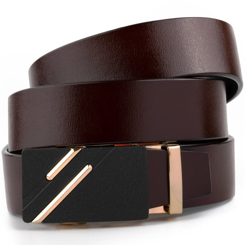 Кожаный мужской ремень насыщенного коричневого цвета. Изделие красиво переливается на солнце. Стильный ремень - неотъемлемая часть мужского гардероба. Изделие выполнено из цельного полотна и прослужит вам далеко не один год. Пряжка выполнена из крепкого сплава золотистого цвета с черной заливкой и золотистыми диагональными полосками. Автоматическая пряжка очень проста в эксплуатации. Ремень не привязывает вас к определенной обуви. По качеству аксессуар ничем не уступает дорогим брендам, но при этом стоит значительно дешевле. Уверены, что ремень покорит любого мужчину. Рекомендуем вам данную модель, если вы находитесь в поиске качественного повседневного ремня.