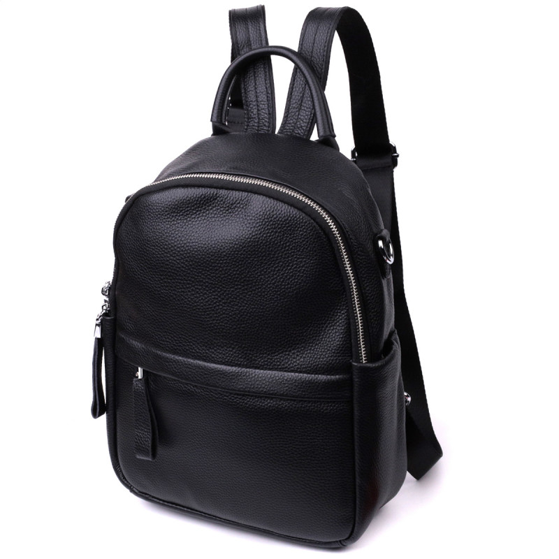 Вместительный женский рюкзак в стильном и современном дизайне. Материал изготовления – натуральная кожа высокого класса с повышенной прочностью. Носить рюкзак можно в руке и на спине, для этого имеются две кожано-текстильные регулируемые лямки, и маленькая кожаная ручка, а также на плече как сумку, для этого есть съемный текстильный ремешок. Рюкзак имеет одно основное отделение и несколько внутренних и внешних карманов, что очень удобно и практично. Цвет изделия – классический черный, фактура – зернистая, фурнитура цвета серебра . Данная модель несомненно станет отличным подарком для дочери, подруги или девушки.