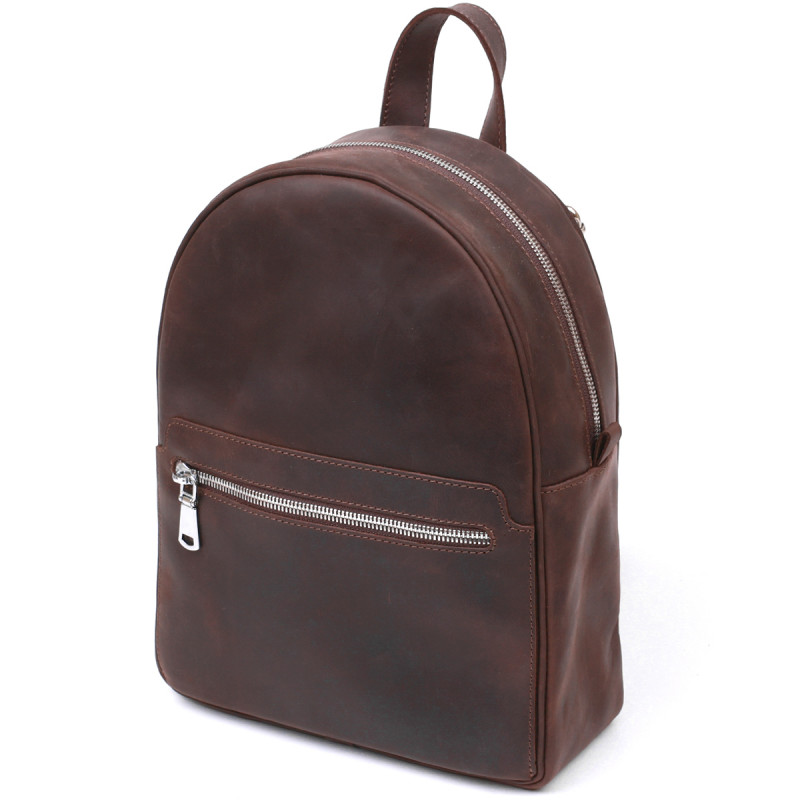 Небольшой женский рюкзак в стильном аккуратном дизайне от украинского производителя. Материал изготовления – плотная натуральная кожа высокого качества с повышенной прочностью. Внутри есть одно просторное отделение и два кармана, в том числе один на молнии. На внешней стороне также есть небольшой карман, что очень удобно. Цвет – насыщенный коричневый.