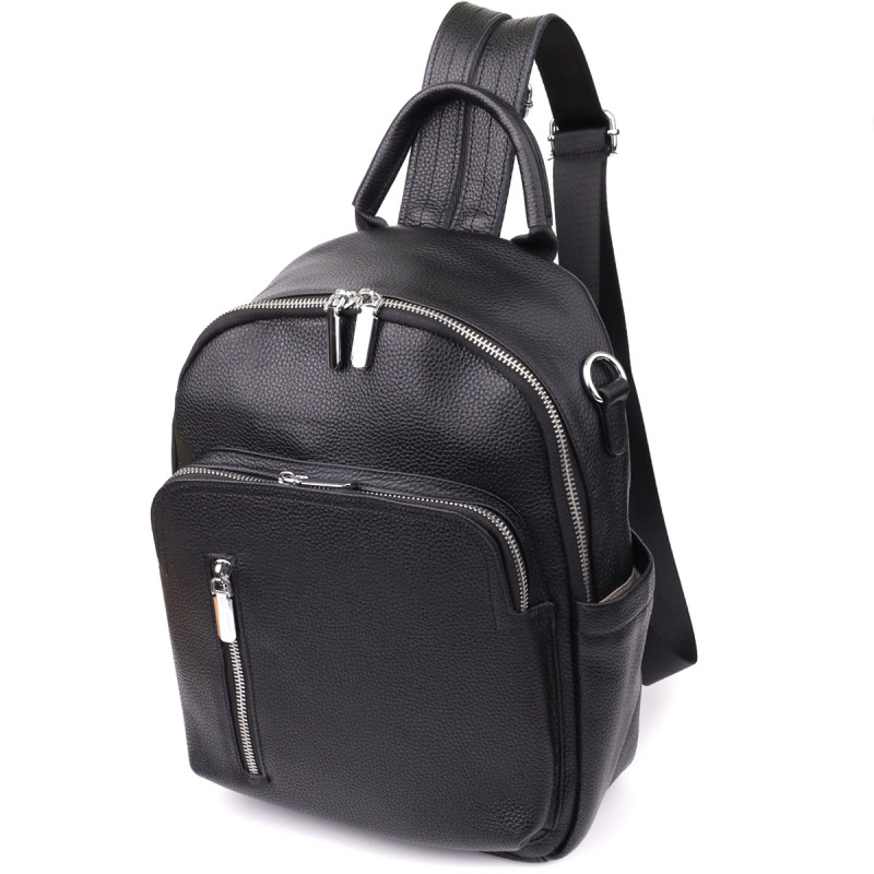 Женский кожаный рюкзак выполнен в функциональном и современном дизайне, идеально подходящем для повседневного использования. Он оснащён одним основным отделением на молнии, внутри которого предусмотрены два кармана на молниях и один открытого типа для удобного хранения необходимых вещей.
