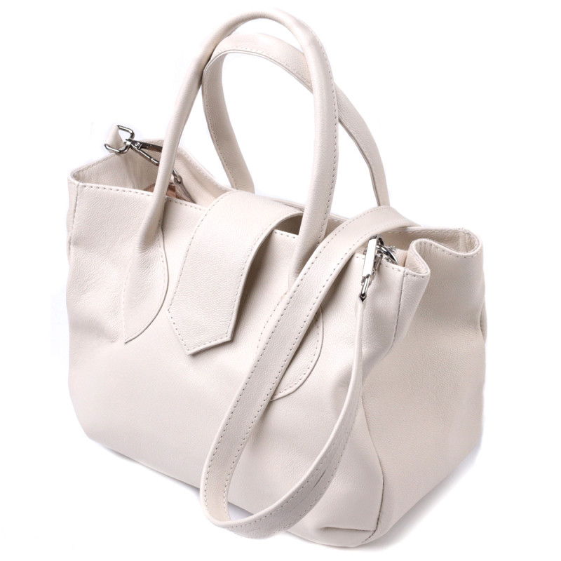Деловая женская сумка для тех, кто любит красивый дизайн без лишних деталей. Такая сумка станет надежным спутником для современной женщины, которая любит не только стильные вещи, а и функциональность. Цвет изделия – благородный бежевый, фактура – зернистая. Материал исполнения – натуральная мягкая кожа с высокими показателями качества. Носить сумку можно в руках и на плече для этого предусмотрены две крепкие кожаные ручки и съемный плечевой ремень, что регулируется. Отличный вариант сумки на каждый день, ведь она не только привлекательна снаружи, но и оснащена разумной системой внутренних отделений, что позволит продуманно и органично организовать пространство внутри. Также в изделии использована качественная фурнитура серебряного цвета.
