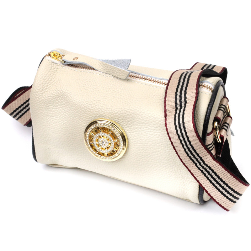 Женская интересная сумка в белом с молочным оттенком цвете из натуральной кожи с высоким показателем качества и износостойкости. На лицевой стороне расположено круглое украшение с камушками, что придает сумке стильного и изысканного вида. Аксессуар состоит из одного основного отделения, потайного кармана на молнии, кармана открытого типа и кармана на молнии снаружи. Носить сумку можно на плече и через плечо, для этого имеется текстильный не съемный ремень. В изделии использована качественная фурнитура цвета желтого золота. Универсальный вариант сумки как на вечер так и в качестве сумочки на каждый день.