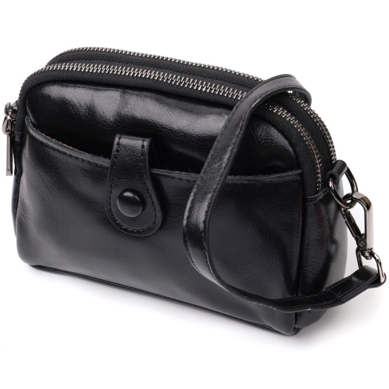 Компактная женская сумка в классическом черном цвете на два автономных отделения из натуральной глянцевой кожи, которая неприхотлива в уходе и долго носится. Аксессуар состоит из двух основных отделений, потайного кармана на молнии, кармана открытого типа, кармана на лицевой стороне, что закрывается хлястиком на магнит и кармана на молнии снаружи, на тыльной стороне. Носить сумку можно в руках, на плече и через плечо, для этого имеется кожаный съемный ремень. В изделии использована качественная фурнитура цвета темного серебра. Универсальный вариант сумки как на вечер так и в качестве сумочки на каждый день.