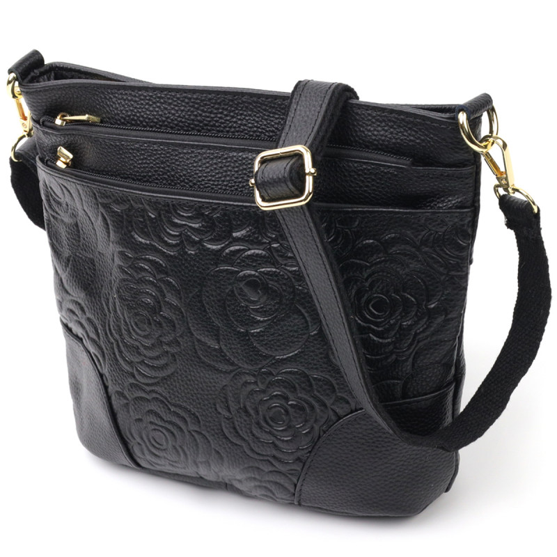 Стильная женская сумка среднего размера из натуральной высокопрочной кожи с цветочным тиснением. Имеет классический черный цвет и зернистую фактуру. Фурнитура выполнена в цвете под золото. Модель долгое время остается в идеальном состоянии, такую сумку приятно носить. Может быть отличным вариантом для подарка близкому человеку.