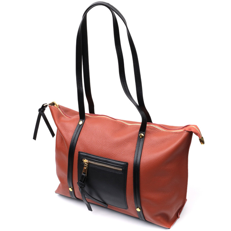 Женская вместительная сумка, в сочетании двух цветов коричневого и черного. Пошито изделие из натуральной кожи флотар, которая неприхотлива в уходе и долго носится. Аксессуар состоит из двух отделений и трех карманов на молниях разной величины. Носить сумку можно на плече и в руках, для этого имеются удлиненные кожаные ручки. В аксессуаре использована качественная фурнитура цвета желтого золота.