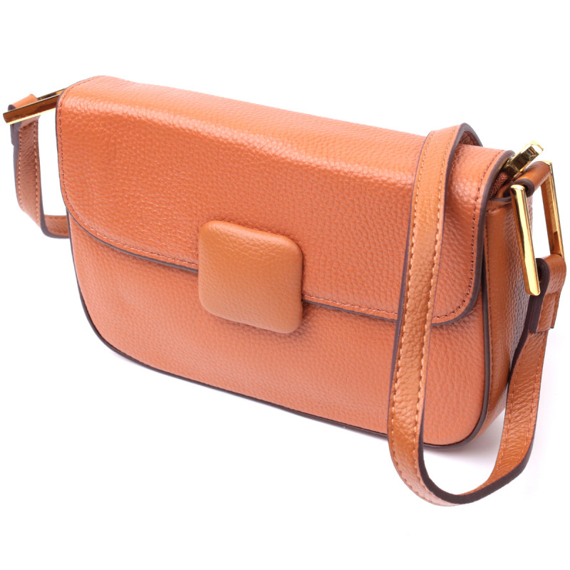 Модная женская сумка в стильном терракотовом цвете с твердым каркасом из натуральной кожи с высоким показателем качества и износостойкости. Аксессуар состоит из основного отделения, что закрывается на молнию и клапаном на магнит, внутри которого находится потайной карман на молнии и карман открытого типа. Носить сумку можно на плече, через плечо для этого имеется несъемный регулируемый кожаный ремень, а также как клатч под рукой. В изделии использована качественная фурнитура цвета желтого золота.