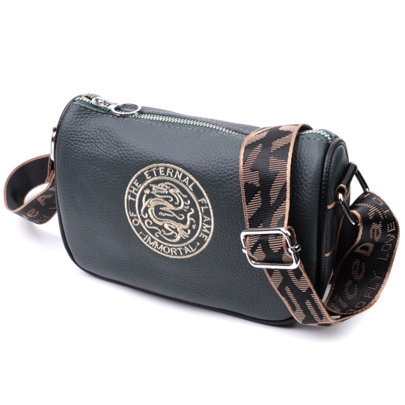 Модная женская сумка с вышивкой на лицевой стороне из натуральной кожи Vintage Темно-зеленая