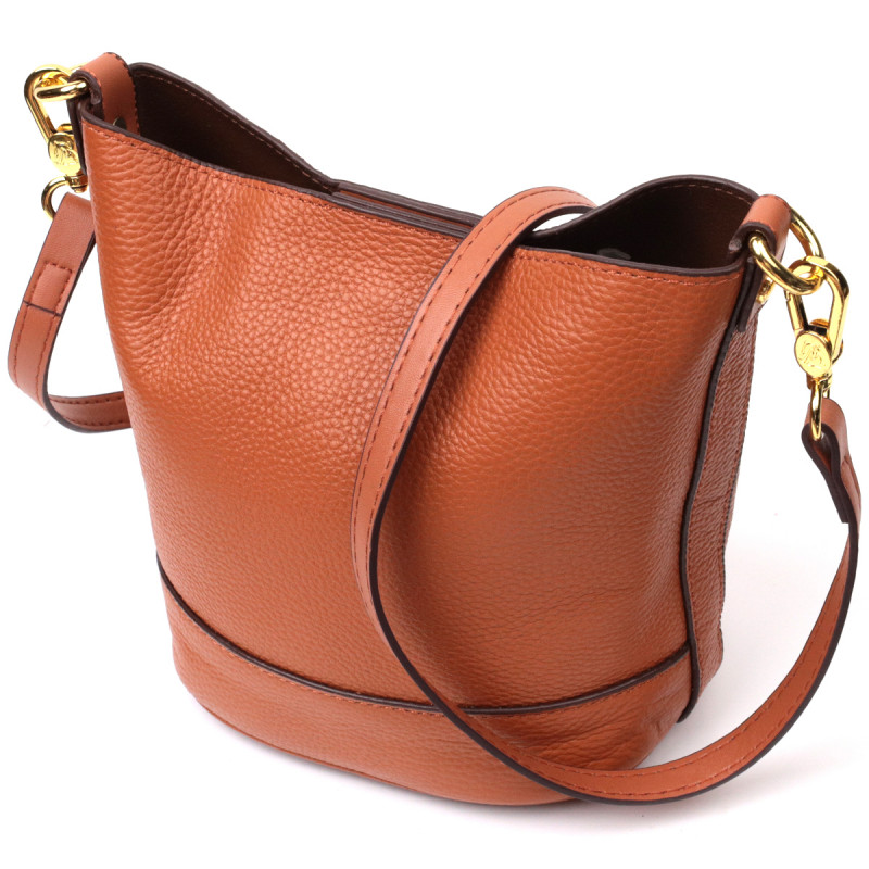 Качественная женская сумка с твердым дном, без подкладки и с косметичкой внутри. Изделие пошито из качественной натуральной кожи, которая долго носится и не теряет свой первоначальный вид. Аксессуар состоит из одного отделения в котором пристегивается косметичка, что закрывается на молнию. Носить сумку можно на плече и через плечо, для этого имеется кожаный съемный ремень. В изделии использована качественная фурнитура цвета желтого золота. Универсальный вариант сумки как на вечер так и в качестве сумочки на каждый день.