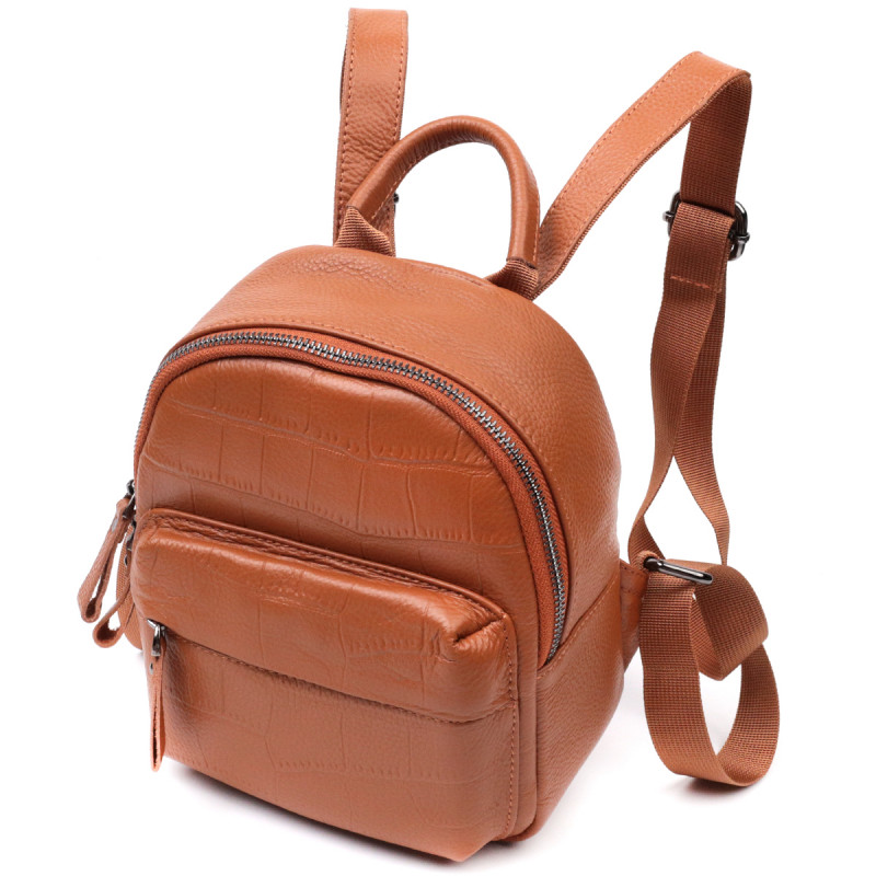 Стильный женский рюкзак терракотового цвета из натуральной кожи с высоким показателем качества и износостойкости. Фишкой этого изделия является фактурная лицевая сторона с тиснением под крокодила. Аксессуар состоит из одного отделения в котором карман на молнии и карман открытого типа, накладной карман снаружи, что закрывается на молнию и встроенный карман на молнии, на тыльной стороне. Носить сумку можно на плече и руках. В изделии использована качественная фурнитура серебряного цвета.